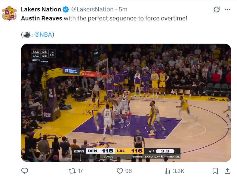 湖人官方也盛赞里夫斯帮助球队拖入了加时赛。